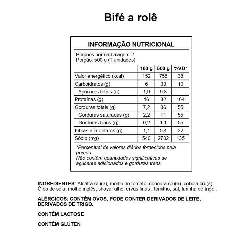 Peso 400g – Bife à rolê, macio e temperado e enrolado entorno de palitos de cenoura, cozido em molho.