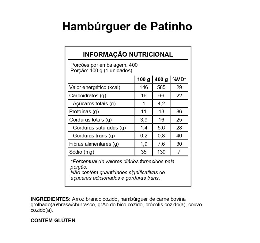 Peso 400g – Hambúrguer de patinho, arroz, brócolis, couve‑flor e grão‑de‑bico rico em proteínas vegetais. Tudo preparado com ingredientes selecionados e sem conservantes, proporcionando um almoço completo, nutritivo e cheio de energia.