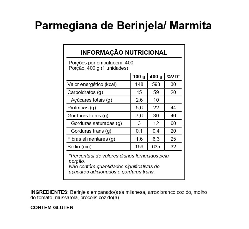 Peso 400g – Berinjela empanada, molho vermelho, queijo e arroz